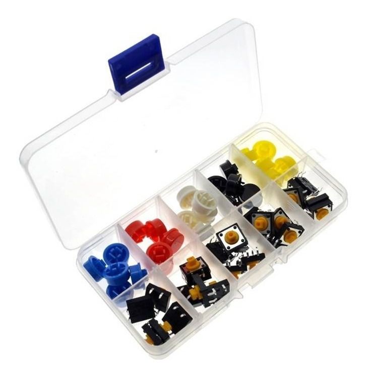 - O conjunto é composto por 25 Push Buttons 12x12, os quais são botões pulsadores utilizados comumente para dar ordem de acionamento em determinados projetos ou equipamentos ativados geralmente sempre que pulsados.